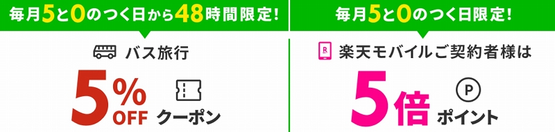毎月5と0のつく日はバス旅行が5%OFFになるクーポンを配布、さらに楽天モバイル契約者はポイント5倍になります。