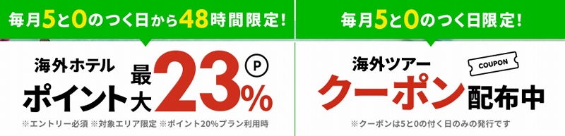 - 毎月5と0のつく日は海外ホテル最大23%OFF・海外ツアー最大5万円クーポン